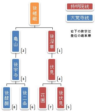 両者のうち、後深草天皇の方は持明院統という家系です。一方で、亀山天皇の方が大覚寺統という家系です。 こうして朝廷が真っ二つに分かれて激しくお互いのことを目の敵にして混乱いました。このままではいけないということで、幕府がそこに割って入って「このままずっと対立しても仕方がないので、ここは一つルールを決めませんか?」ということで、幕府による調停により、両統が交互に天皇に即位するルール(両統迭立)を定めました。